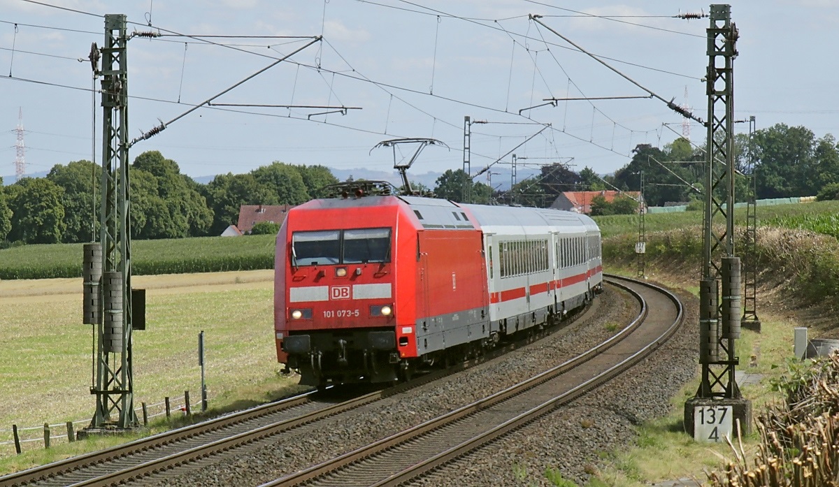 Auf der legendären Rollbahn ist die 101 073-5 am 28.07.2022 mit einem IC bei Ostercappeln in Richtung Süden unterwegs (Bildausschnitt). Zwischen Bohmte und Vehrte muss zur Überwindung des Wiehengebirges auf langen 1:200-Steigungen ein Höhenunterschied von 64 Metern überwunden werden. Für die ICE und IC von heute kein Problem, aber ich musste unwillkürlich an Ludwig Rotthowes Fotos von schwer arbeitenden 01.10 denken, die er vor der Elektrifizierung 1968 an dieser Strecke machte.