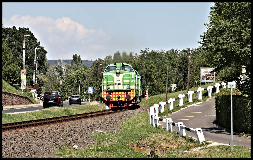 M 61 019 hat hier gerade am 16.7.2022 um 11.20 Uhr den Bahnhof Badacsonytomaj verlassen und ist mit einem IR nach Tapolca in Höhe des Strandbades unterwegs.