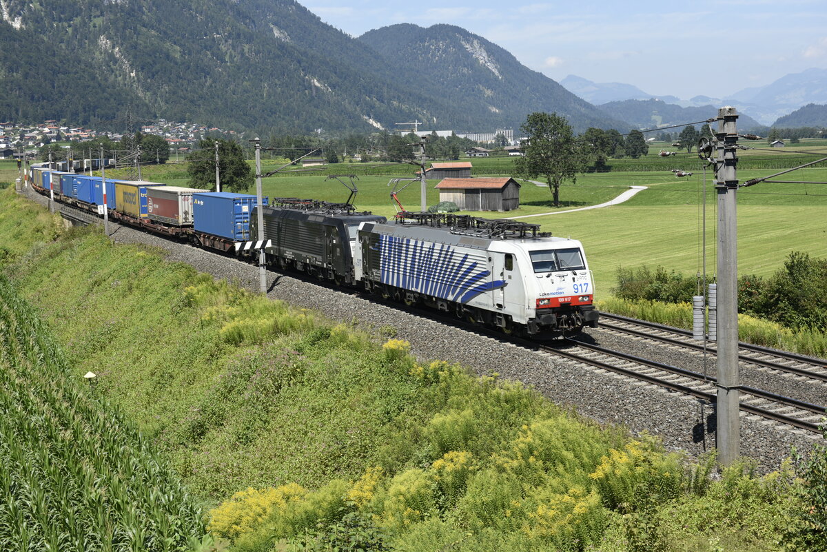 Die 189 917 von Lokomotion und eine Schwesterlok von MRCE auf der Inntalstrecke kurz nach Kufstein, nahe der Ortschaft Langkampfen in Richtung Brenner. Aufgenommen am 28.07.22