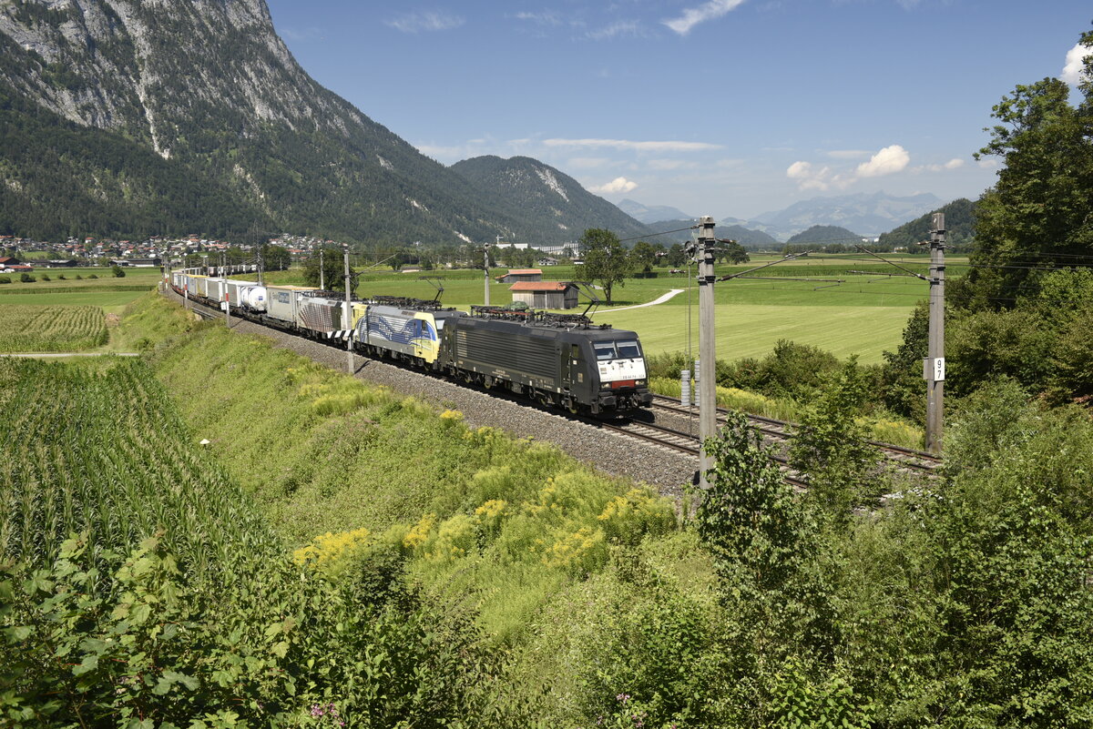 Die 189 924 von MRCE und eine Schwesterlok die "Cream Moving Europe" von RTC und eine weitere, auf der Inntalstrecke kurz nach Kufstein, nahe der Ortschaft Langkampfen in Richtung Brenner. Aufgenommen am 28.07.22