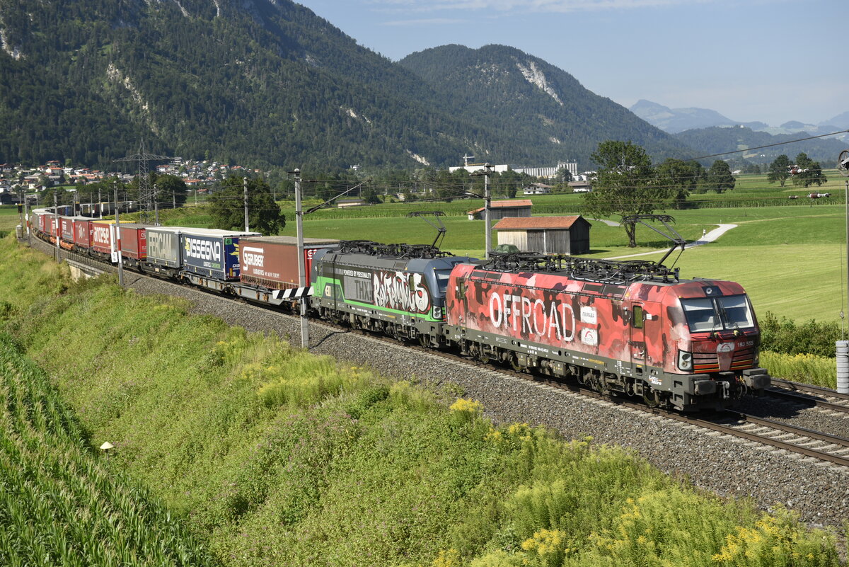 Die 193 555 "Offroad" von TXL und eine weitere 193 von ELL auf der Inntalstrecke kurz nach Kufstein, nahe der Ortschaft Langkampfen in Richtung Brenner. Aufgenommen am 28.07.22