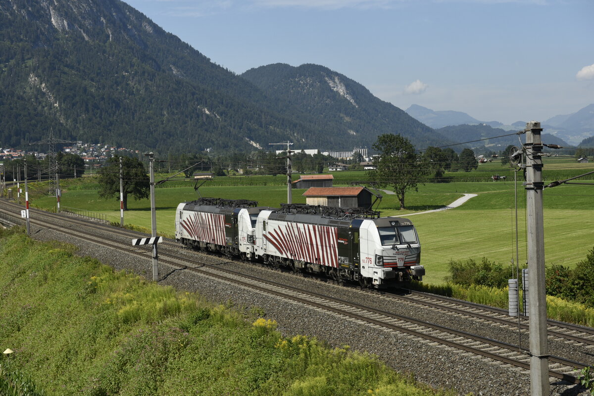 Die 193 776 und die 193 775 von Lokomotion auf der Inntalstrecke vor Kufstein, nahe der Ortschaft Langkampfen aus Richtung Brenner kommend. Aufgenommen am 28.07.22