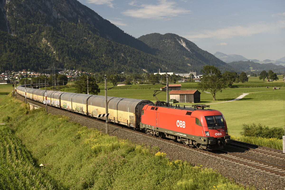 Die ÖBB 1016 037 mit Autotransportwagen auf der Inntalstrecke kurz nach Kufstein, nahe der Ortschaft Langkampfen in Richtung Brenner. Aufgenommen am 28.07.22