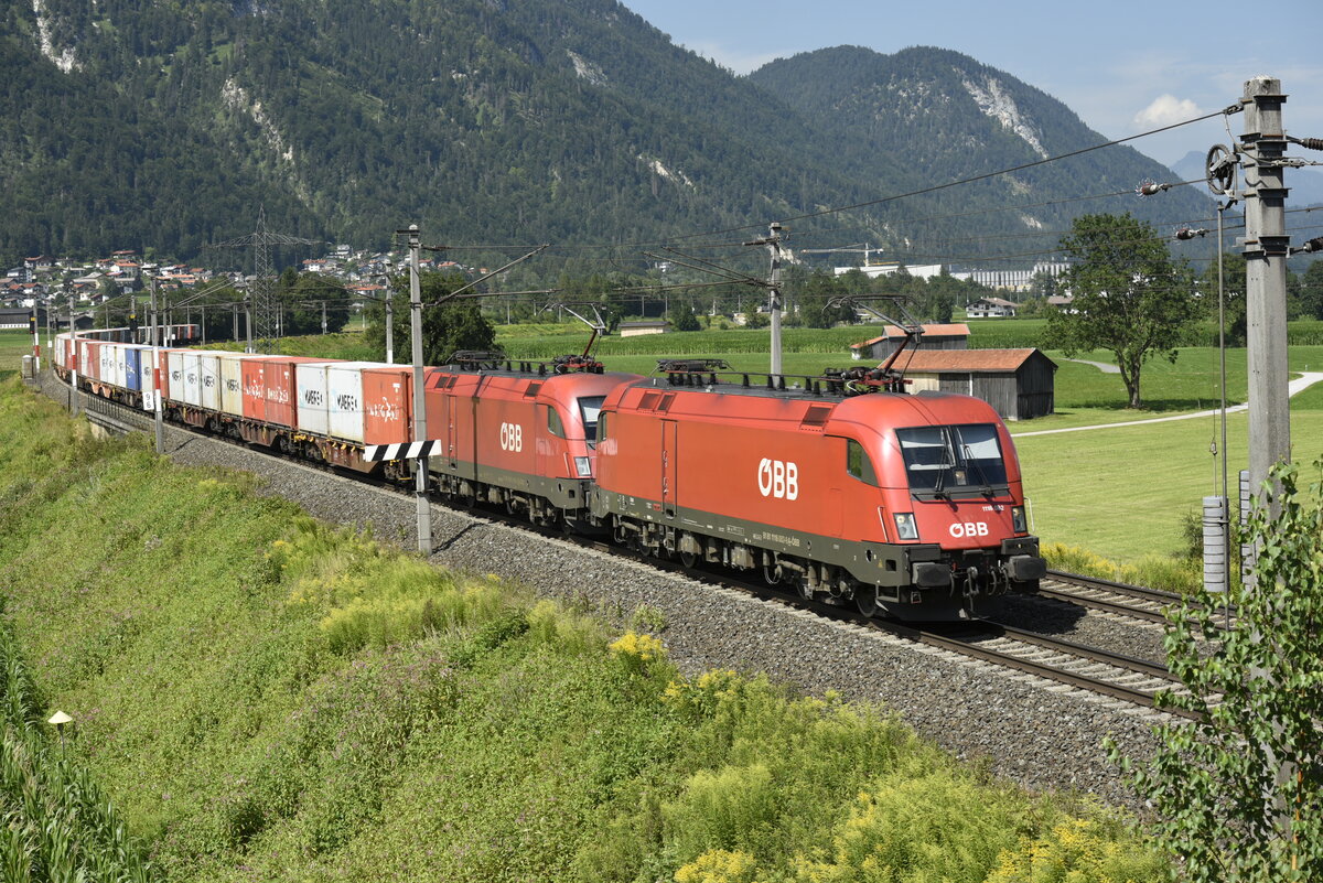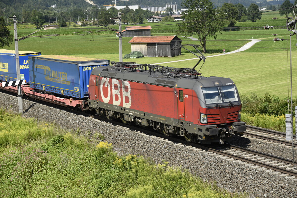 Die ÖBB 1293 069 auf der Inntalstrecke kurz nach Kufstein, nahe der Ortschaft Langkampfen in Richtung Brenner. Aufgenommen am 28.07.22