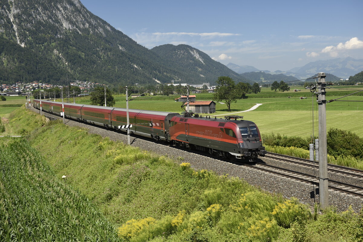 Die ÖBB 1116 243 mit einem Railjet auf der Inntalstrecke kurz nach Kufstein, nahe der Ortschaft Langkampfen. Aufgenommen am 28.07.22