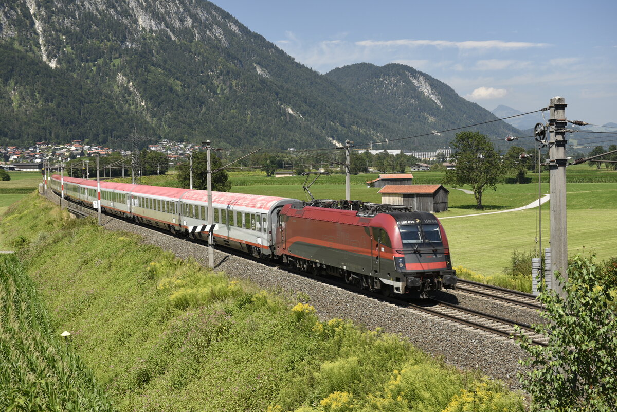 Die ÖBB 1216 019 mit dem DB-ÖBB EuroCity EC 83 München - Verona auf der Inntalstrecke kurz nach Kufstein, nahe der Ortschaft Langkampfen. Aufgenommen am 28.07.22