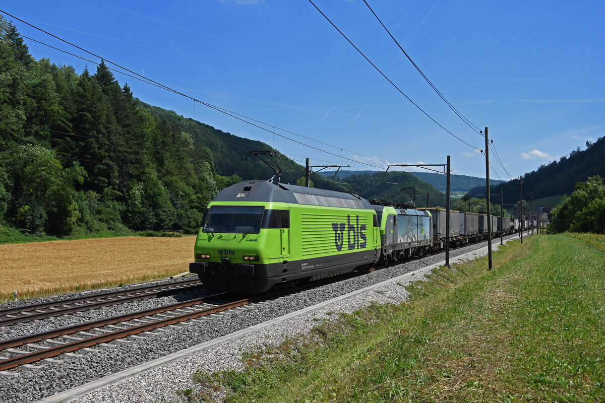 Doppeltraktion, mit den BLS Loks 465 018-0 und 475 403-2 fährt Richtung Bahnhof Gelterkinden. Die Aufnahme stammt vom 16.06.2022.