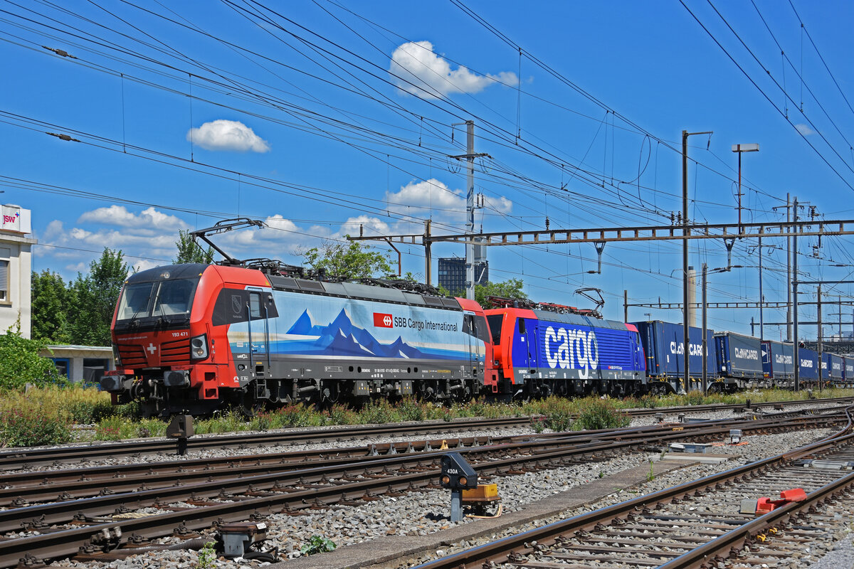 Doppeltraktion, mit den Loks 193 471-0 und 474 013-0 durchfährt den Bahnhof Pratteln. Die Aufnahme stammt vom 12.07.2022.