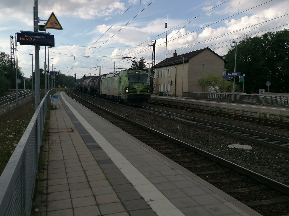 Eine Siemens Vectron von RheinCargo hat gerade einen Kesselwagenzug die Geislinger Steige hochgezogen und fährt nun durch den Bahnhof Amstetten richtung Ulm. Sie bekam Schubunterstützung von DB 185 200-3. Das Bild ist während eines Regenschauers entstanden (30.07.2022)