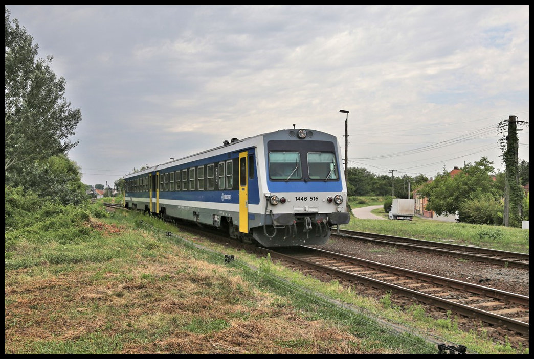 Einfahrt des VT 1446516 am 15.7.2022 um 13.01 Uhr aus Celldömölk in den Bahnhof Papa.