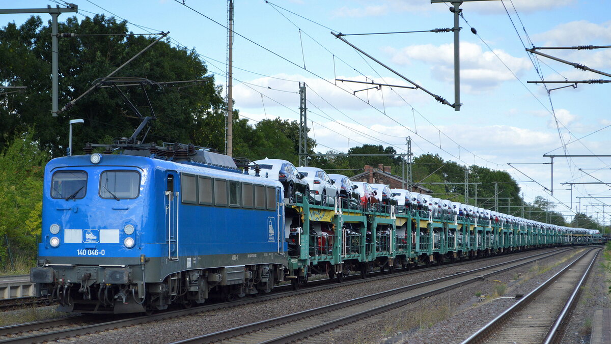 Eisenbahnbau- und Betriebsgesellschaft Pressnitztalbahn mbH, Jöhstadt (PRESS) mit "140 046-0" (NVR: "91 80 6140 837-6 D-PRESS") und PKW-Transportzug am 27.07.22 Durchfahrt Bahnhof Niederndodeleben.