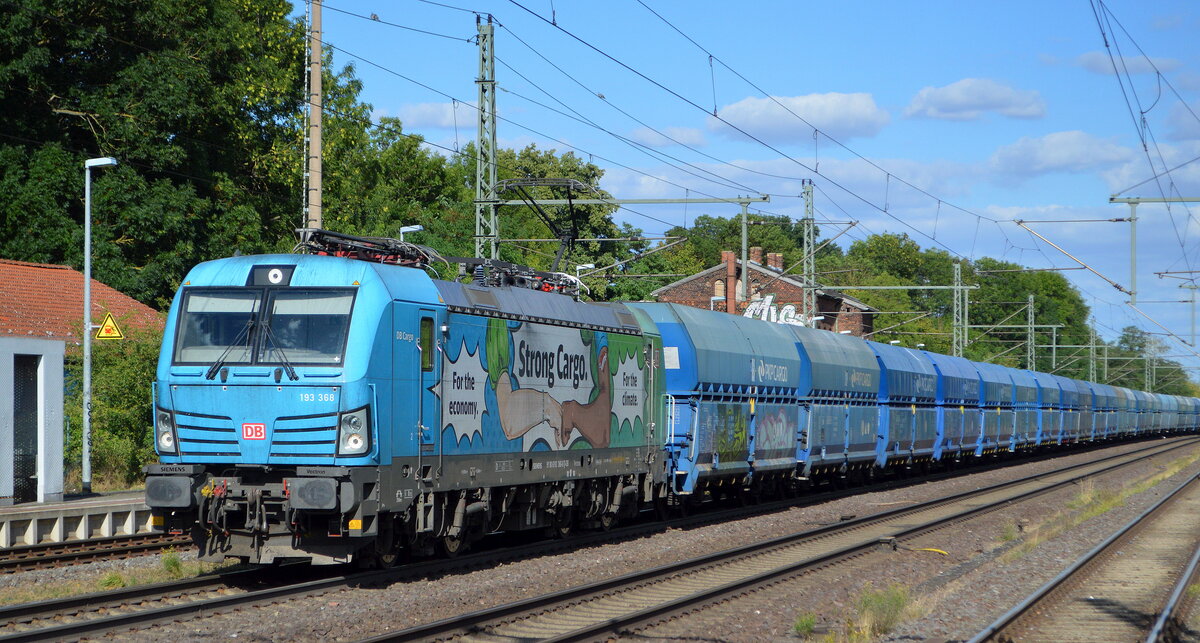 Manchmal gibt es einfach die farblich perfekt aufeinander abgestimmten Lok-/Güterwagengespanne, hier DB Cargo AG [D] mit "193 368" [NVR-Nummer: 91 80 6193 368-4 D-DB] und einem Ganzzug polnischer Selbstentladewagen der PKP Cargo am 27.07.22 Durchfahrt Bahnhof Niederndodeleben.