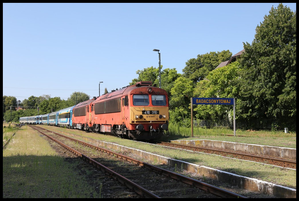 Mit einem IC nach Budapest nähert sich hier am 16.7.2022 um 13.44 Uhr die MAV 418154 dem Haltepunkt Nemesgulacs Kisapati. Hinter der Lok läuft leider verdeckt die Nostalgie Diesellok 40.2103 mit.