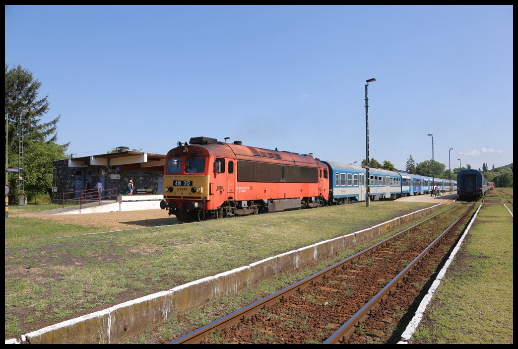 MAV 418312 hält am 16.7.2022 um 10.04 Uhr mit dem IR nach Tapolca im Bahnhof Badacsonytomaj.