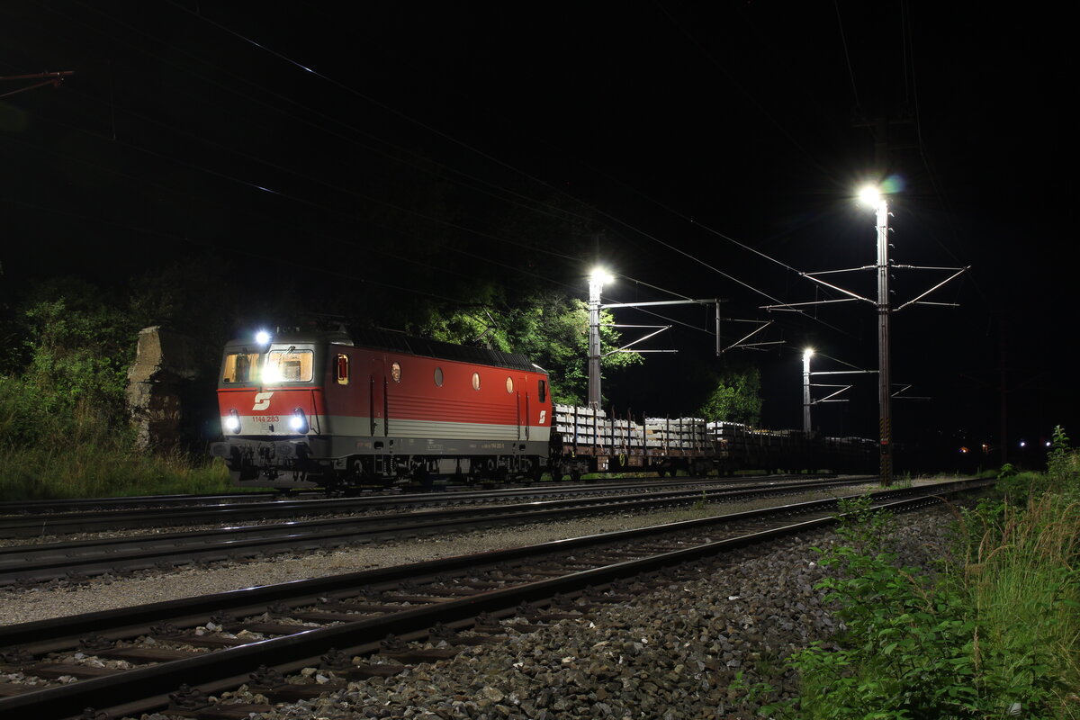 Nachdem die 1144 259 den GAG57705 von Gloggnitz bis Spital am Semmering vorgespannt hat, bringt die 1144 283 den mit Schwellenelementen für den Koralmtunnel bestimmten Güterzug alleine weiter nach Graz Vbf.