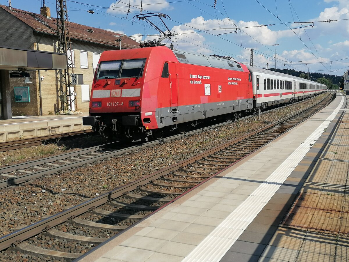Nachschuss auf die Pep Werbelok 101 137-8, die einen Intercity Richtung Ulm Hbf schiebt.