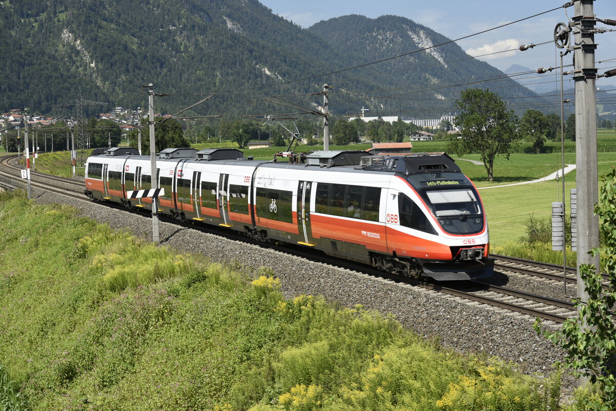 ÖBB 4024 062-3 im neuen CityJet Tirol Design auf der Inntalstrecke kurz nach Kufstein, nahe der Ortschaft Langkampfen. Aufgenommen am 28.07.22