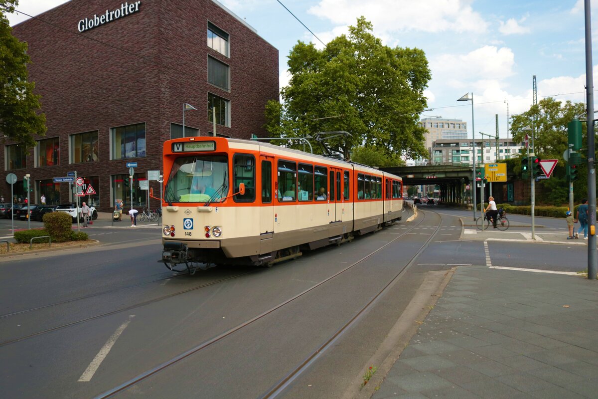 Auf dem Weg vom Hauptbahnhof zur Stadthalle verlässt der ex-Neusser Tw 17 am 30.07.2022 die Haltestelle Glockhammer in der Neusser Innenstadt