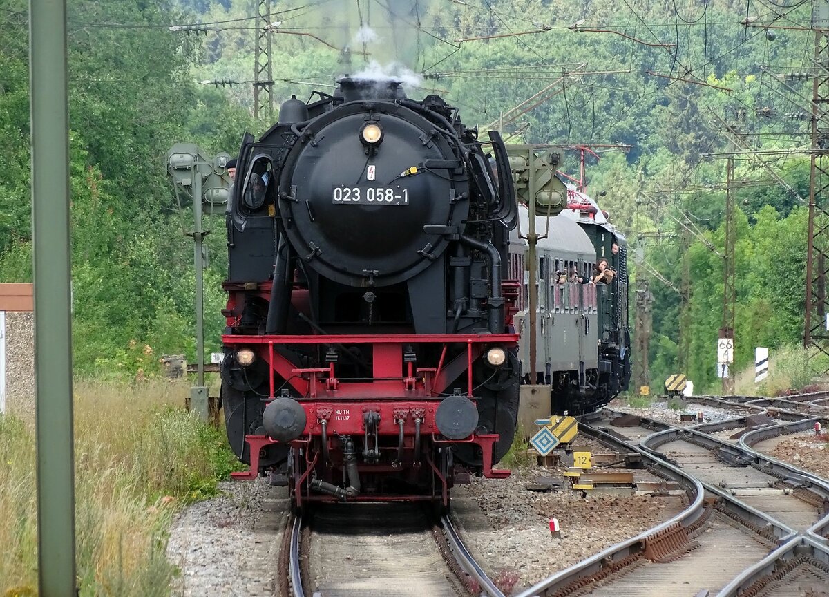 023 058 der EUROVAPOR am 10.07.2022 bei der Einfahrt mit einem Sonderzug aus der Geislinger Steige in den Bahnhof Amstetten.