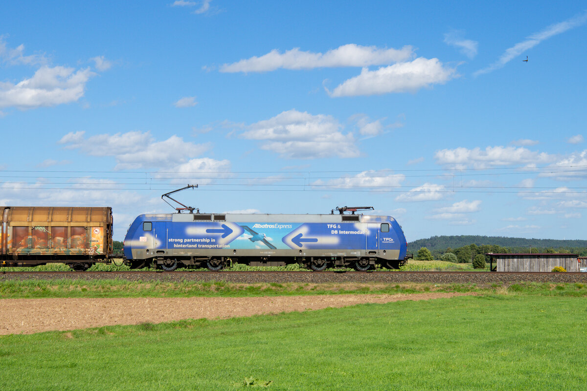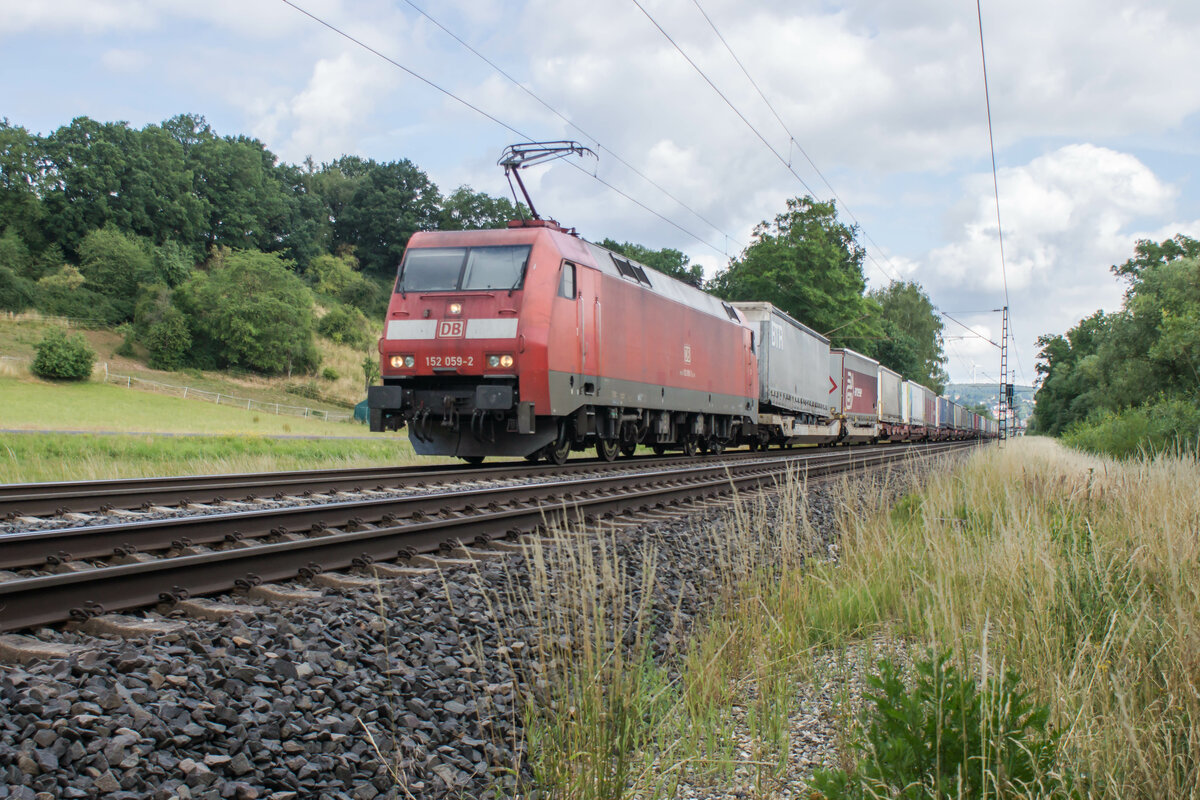 152 136 DB Cargo "TFG Transfracht" mit einem gemischten Güterzug bei Triesdorf Richtung Treuchtlingen, 26.08.2020