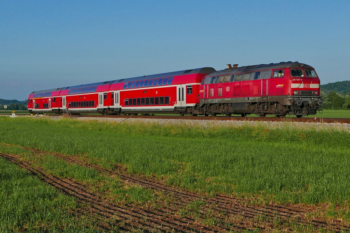 218 427-3 am 28.06.2019 mit dem RE 3223, Aulendorf - Lindau, bei Mochenwangen