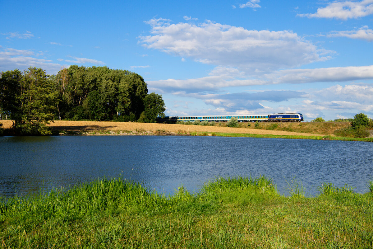 Der ALPEN-SYLT Nachtexpress (RDC Deutschland, NEx 1312 Westerland/Sylt – Salzburg) am 17.07.2022, gezogen von BTE 110 491-8, kurz vor Sonnenaufgang bei Himmelstadt im Maintal.