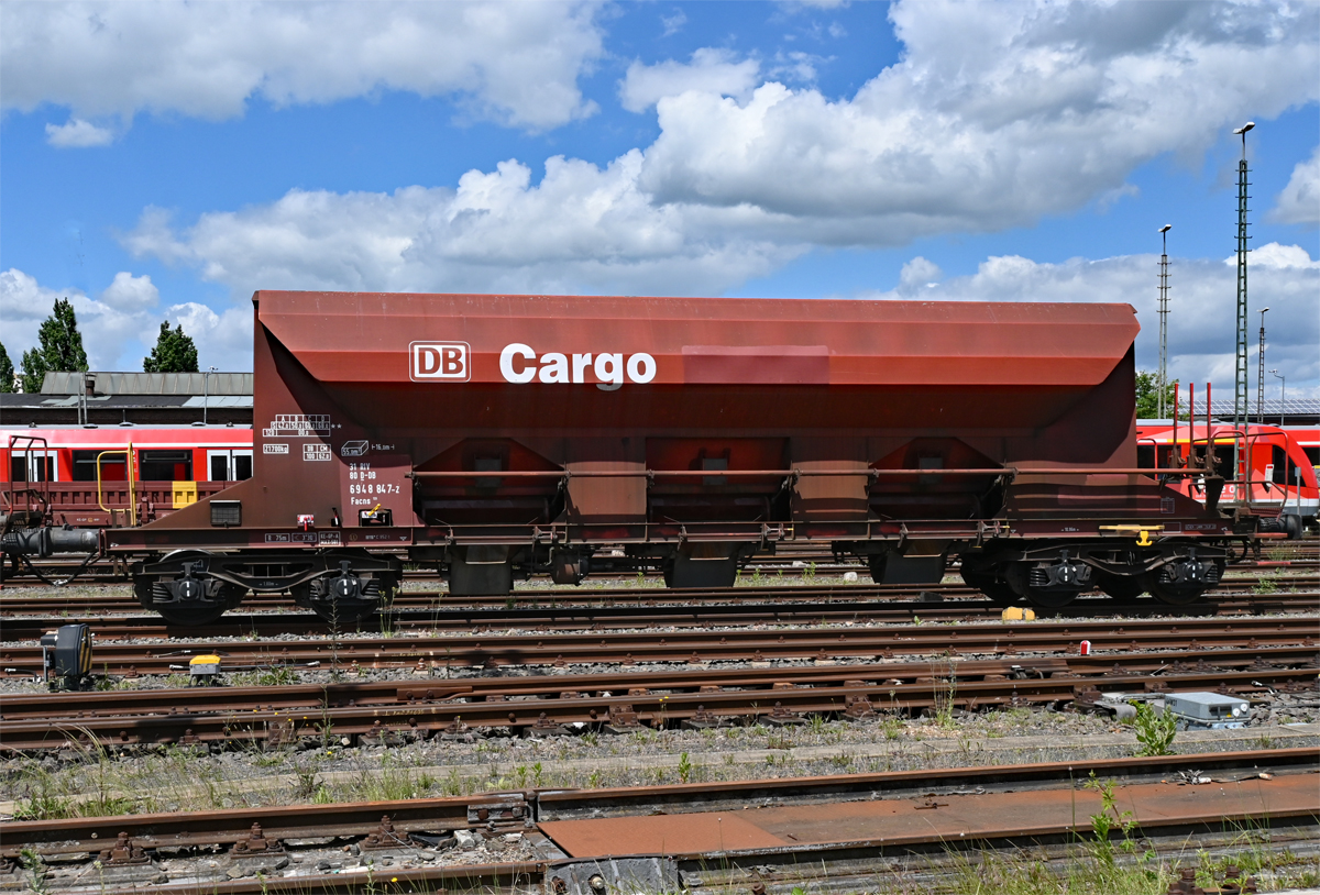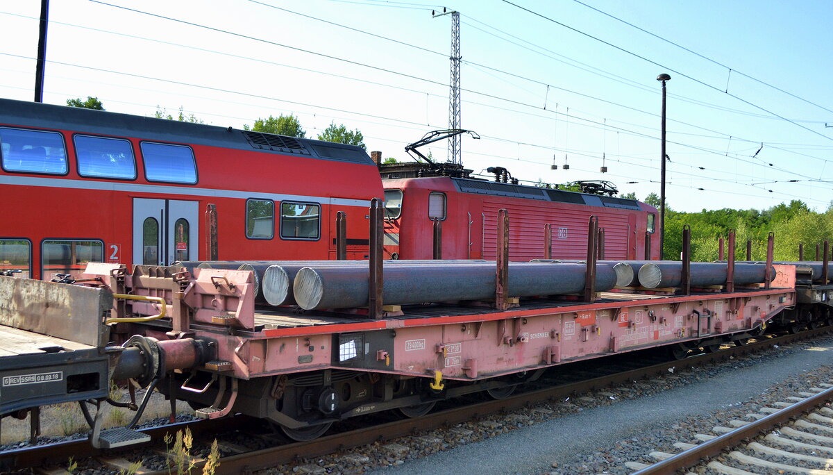 Drehgestell-Flachwagen der DB Cargo mit der Nr. 31 TEN 80 D-DB 4852 17-0 Samms 489 beladen mit rund geformten Stahlfragmenten (Bezeichnung?, keine Bramme) in einem gemischten Güterzug am 22.06.22 Bahnhof Elsterwerda.