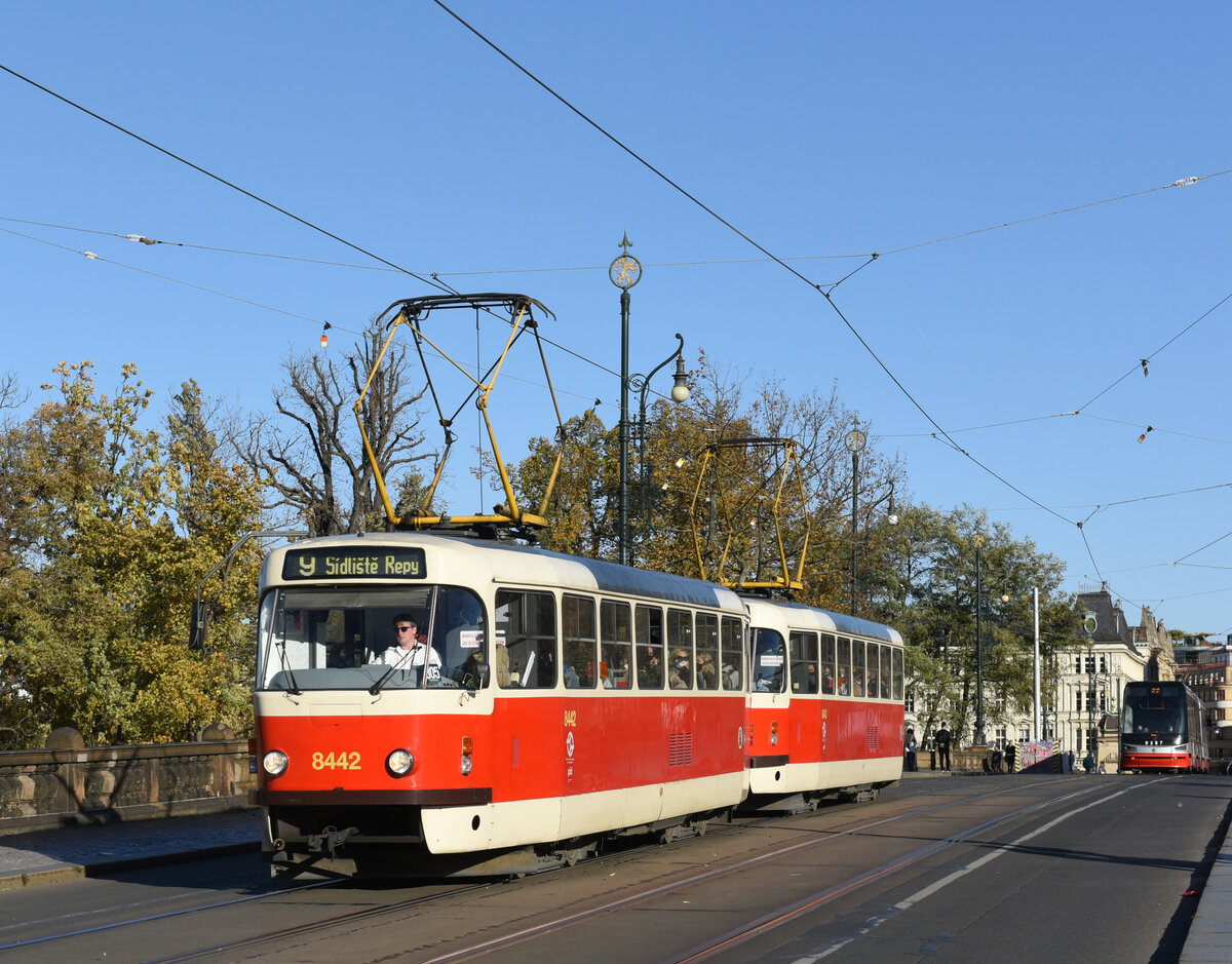 Am Nachmittag des 22. Oktober 2021 überquerten die beiden T3RP Triebwägen 8442 und 8443 als Linie 9 nach Sídliště Řepy die Moldau über die Most Legií.