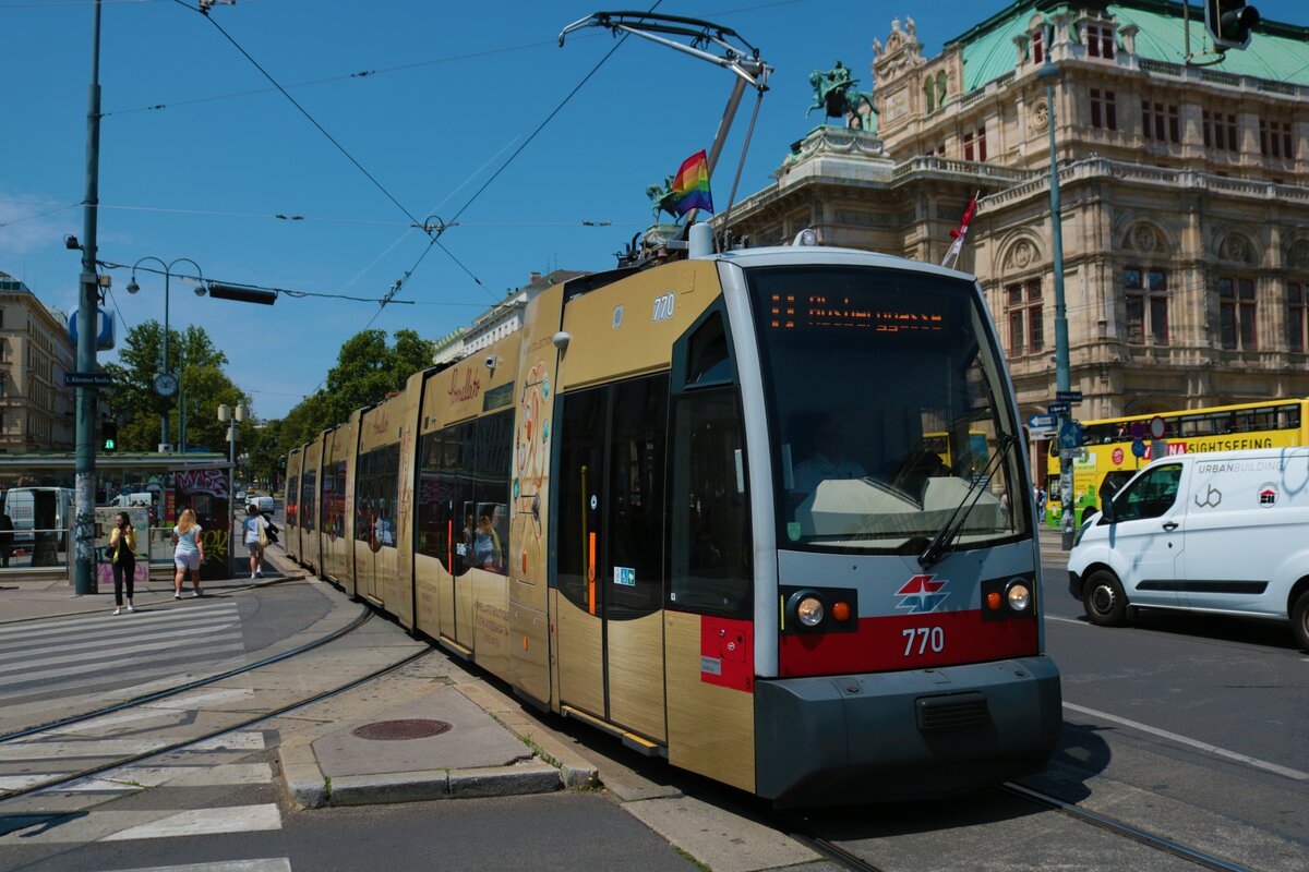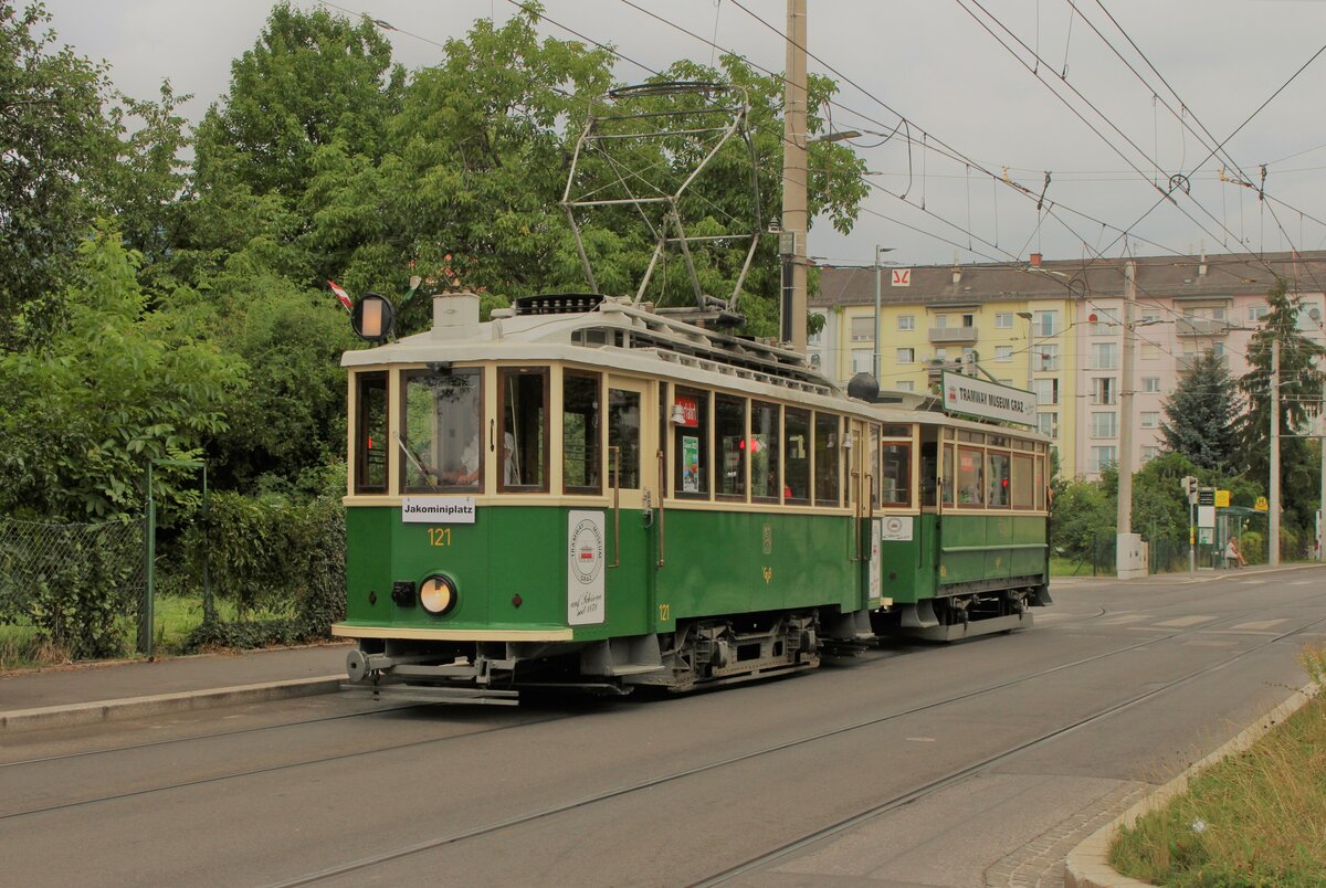 Am 15.7.2022 fuhr der Wagen Nr. 121 mit dem Beiwagen 60B als Sommerbim in der Asperngasse von der Haltestelle Loudongasse Richtung Jakominiplatz.