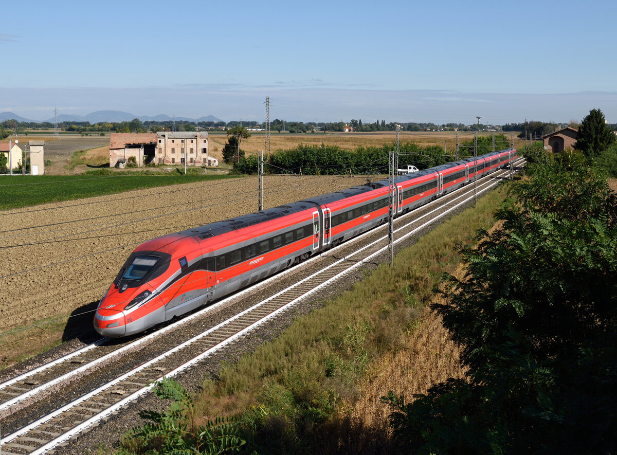 Der rote Pfeil ETR 400 040 "Frecciarossa" FR 9406 von Roma Termini nach Venezia Santa Lucia wurde von mir am Morgen des 21. September 2021 nahe der venezianischen Stadt Rovigo fotografiert.