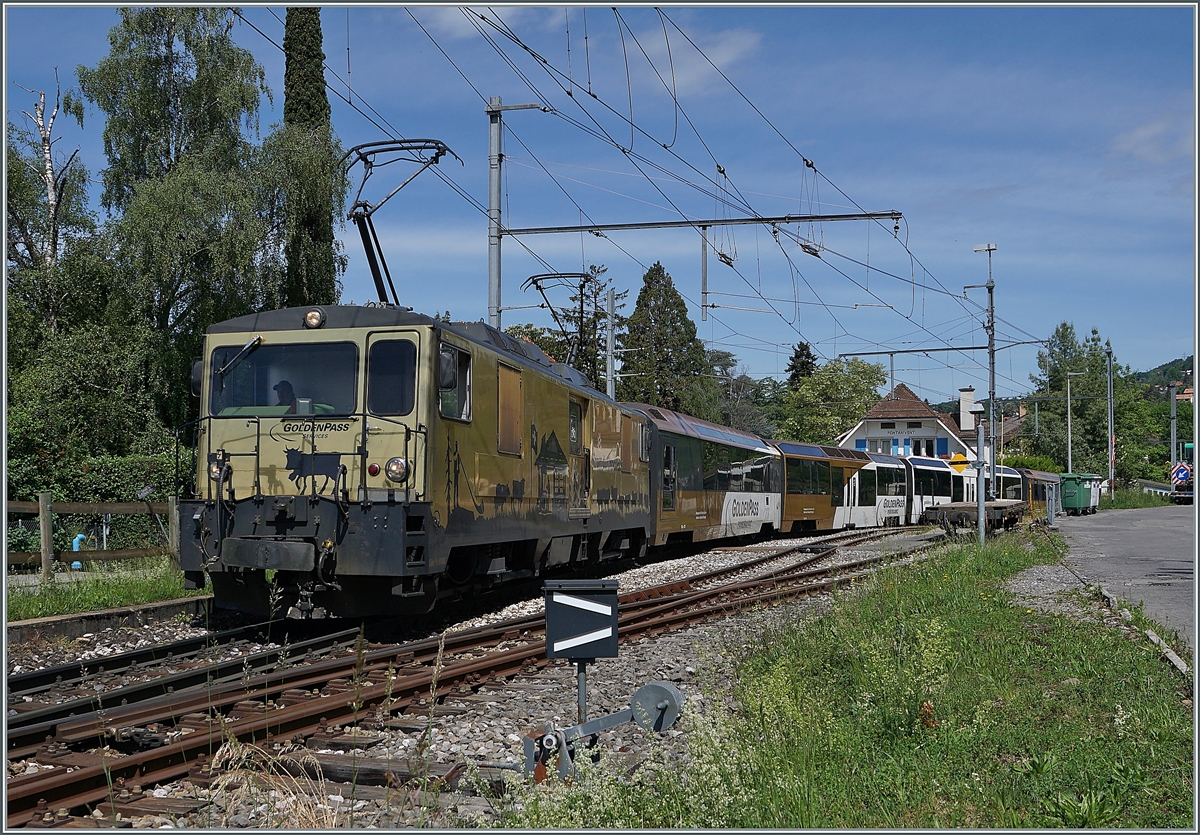 Die MOB GDe 4/4 N° 6001 fährt mit einen MOB Panoramic Express von Montreux nach Zweisimmen durch den Bahnhof von Fontanivent.