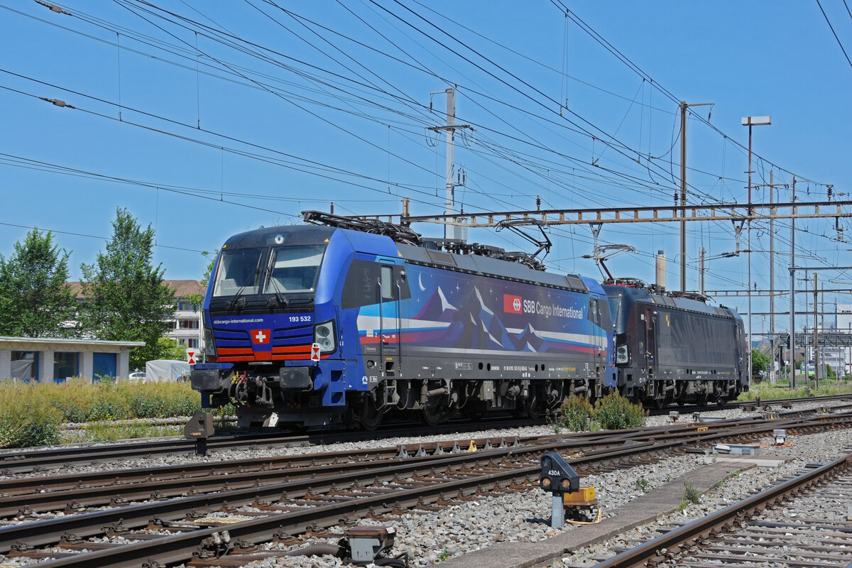 Doppeltraktion, mit den Siemens Vectron 193 661-6 und 193 532-9 durchfährt solo den Bahnhof Pratteln. Die Aufnahme stammt vom 13.06.2022.