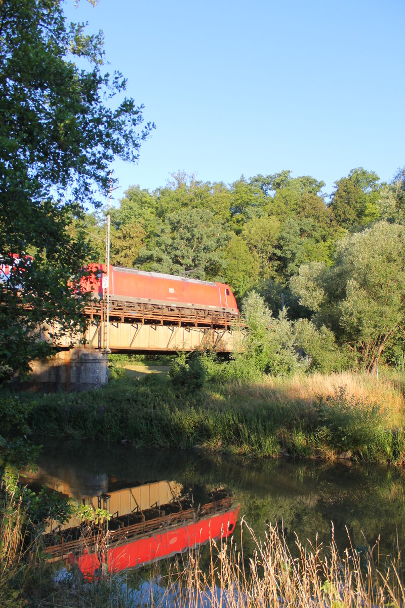 Eine unbekannte 185 überquert am 17.07.2022 die Altmühl kurz hinter Solnhofen. Die Morgensonne scheint schon stark, es wird ein heißer Tag werden.