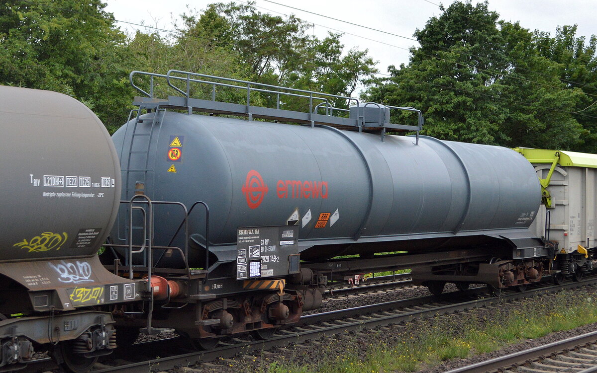 Kesselwagen vom Einsteller ERMEWA SA mit der Nr. 33 RIV 80 D-ERMW 7929 149-2 Zacns Bf. Basel Bad Gbf für das Ladegut lt. UN-Nr.: 886/1052 = Fluorwasserstoff, wasserfrei in einem gemischten Güterzug am 08.07.22 Vorbeifahrt Bahnhof Dedensen Gümmer.