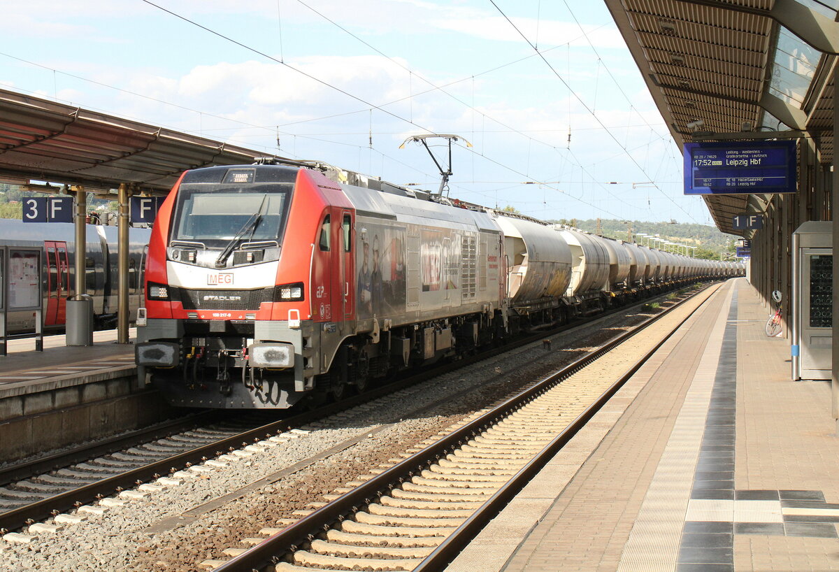 MEG 159 217-9 mit Uacns-Wagen Richtung Bad Kösen, am 13.07.2022 in Naumburg (S) Hbf.