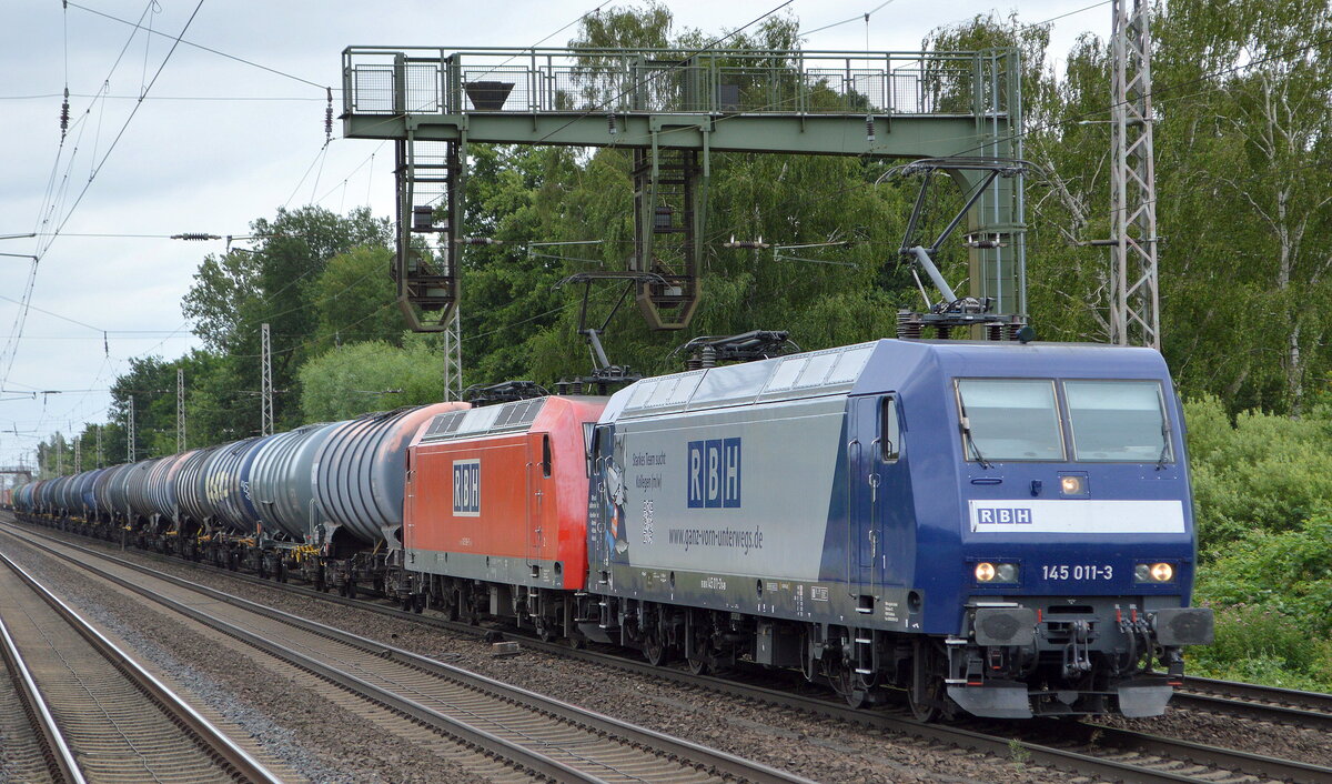 RBH Logistics GmbH, Gladbeck [D] mit der Doppeltraktion "145 011-3" [NVR-Nummer: 91 80 6145 011-3 D-DB] + "145 066-7" [NVR-Nummer: 91 80 6145 066-7 D-DB] und einem Kesselwagenzug am 08.07.22 Vorbeifahrt Bahnhof Dedensen Gümmer.