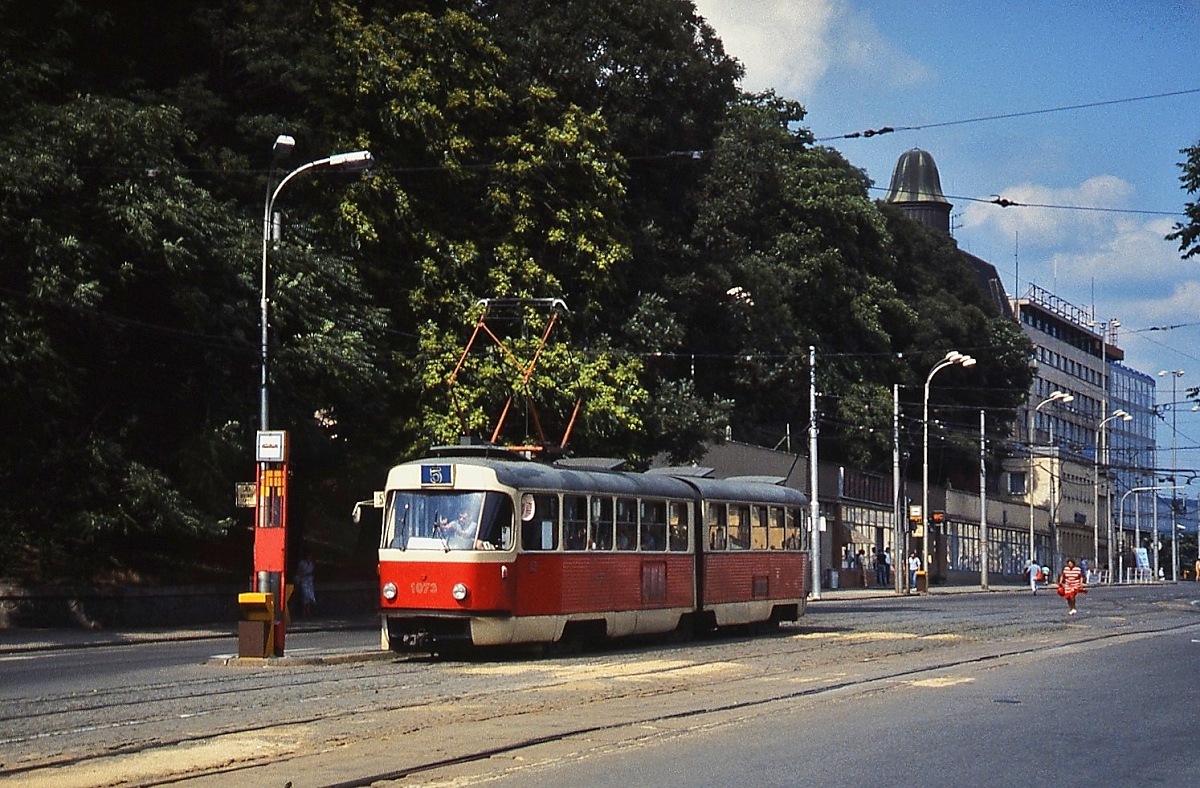 Straßenbahn Brno/Brünn: Der 1975 gelieferte und 2007 ausgemusterte Tatra K2 1073 ist im Juli 1989 auf der Linie 5 unterwegs