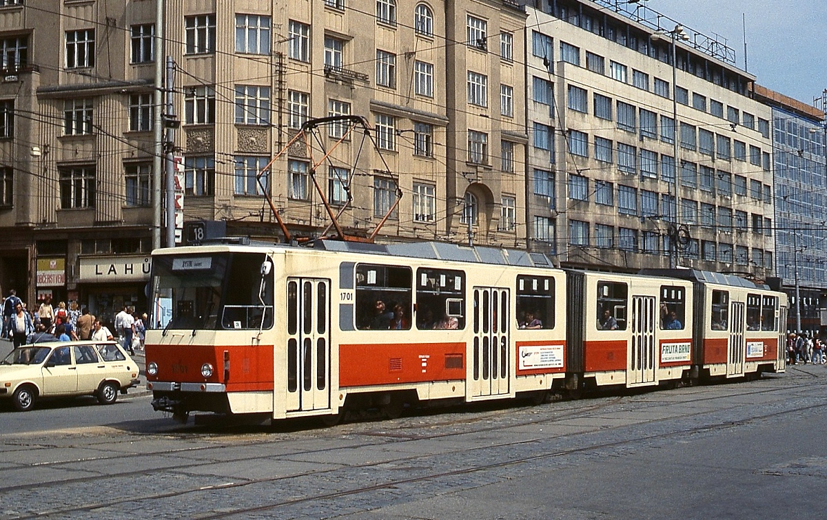 Straßenbahn Brno/Brünn: Der 1986 in Dienst gestellte KT8D5 1701 gehört zur Nullserie, von der Tatra insgesamt 10 Stück an die Verkehrsbetriebe Brno (2), Praha (4), Most (2) und Kosice (2) lieferte. Das Mittelteil wurde später durch ein Niederflurteil ersetzt. Aufnahme im Juli 1989.