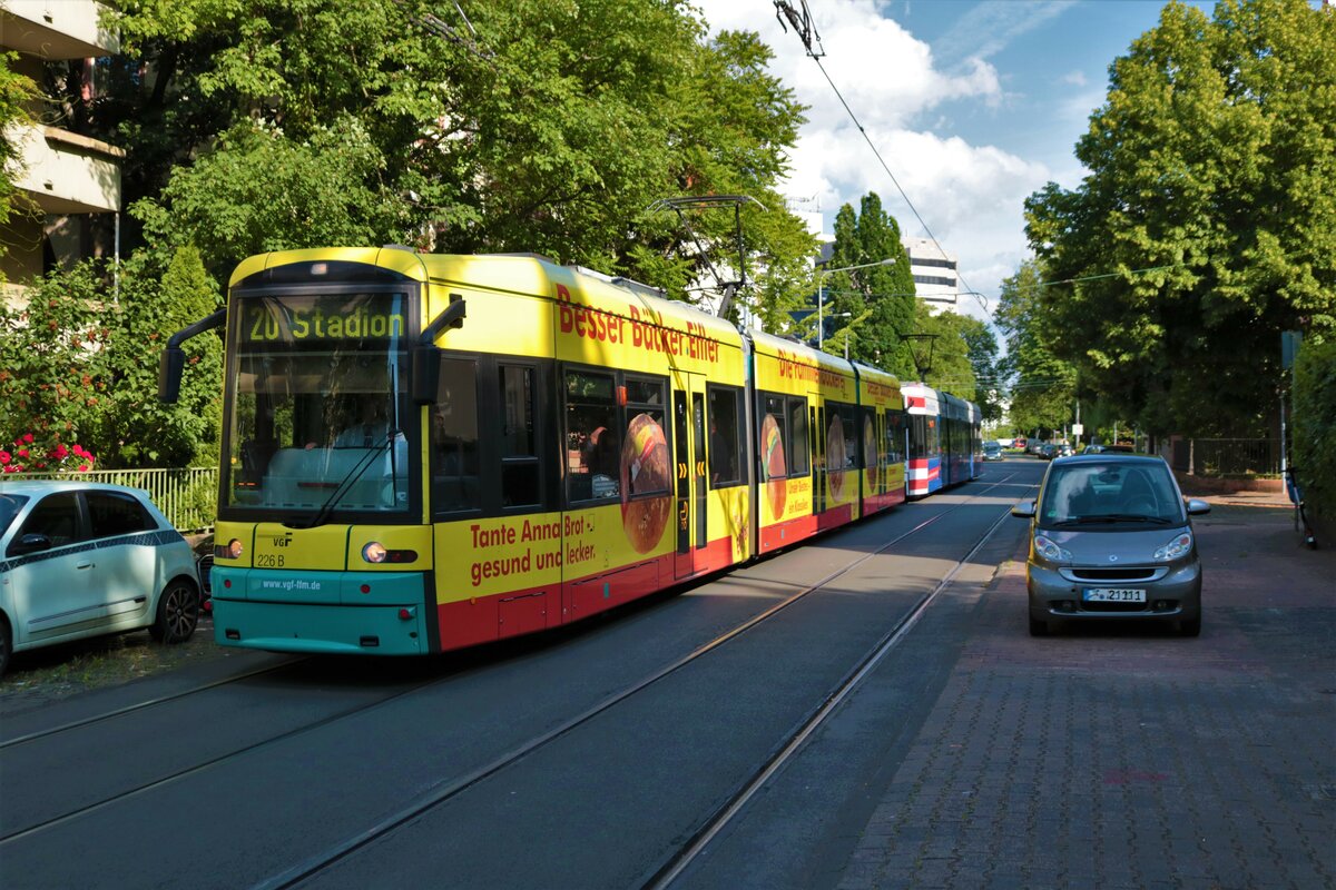 VGF Bombardier Flexity Classic S-Wagen 226+2xx als Linie 20 am 27.05.22 in Frankfurt