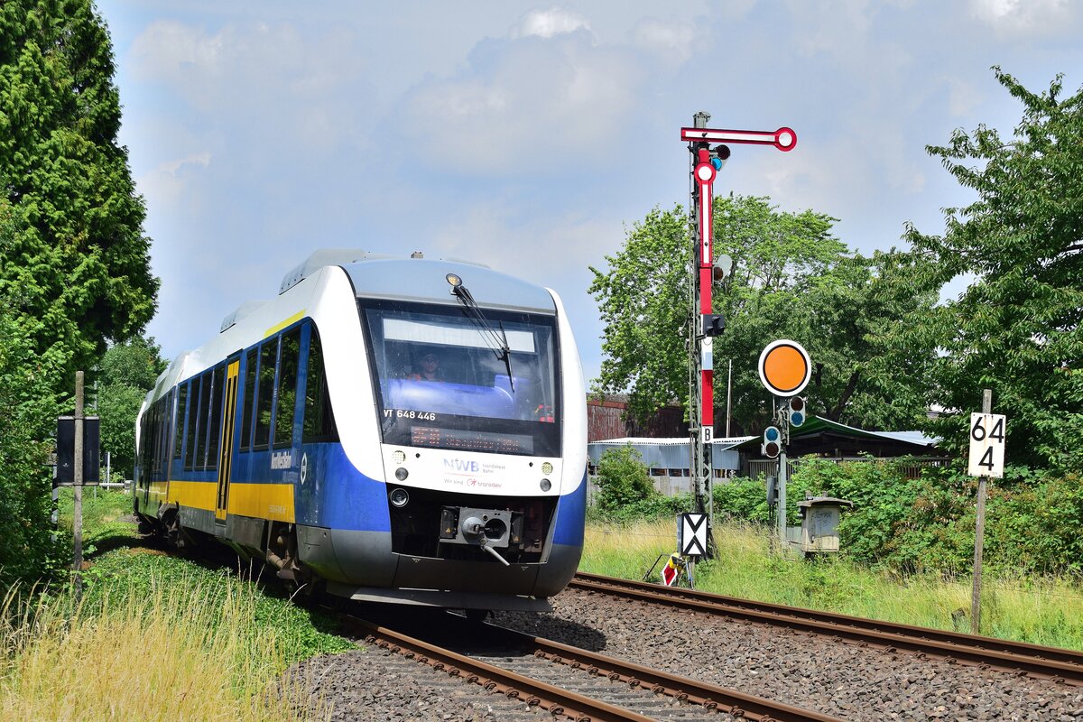 Die Zeit ist abgelaufen. Am 24.6.22 war der letzte Betriebstag auf der Klever Strecke mit der Formsignaltechnik. Am 25.6.22 begann die 5 monatige Sperrung und Umrüstung auf DSTW. Hier passiert 648 446 das Einfahrsignal von Kempen. Kempen 24.06.2022