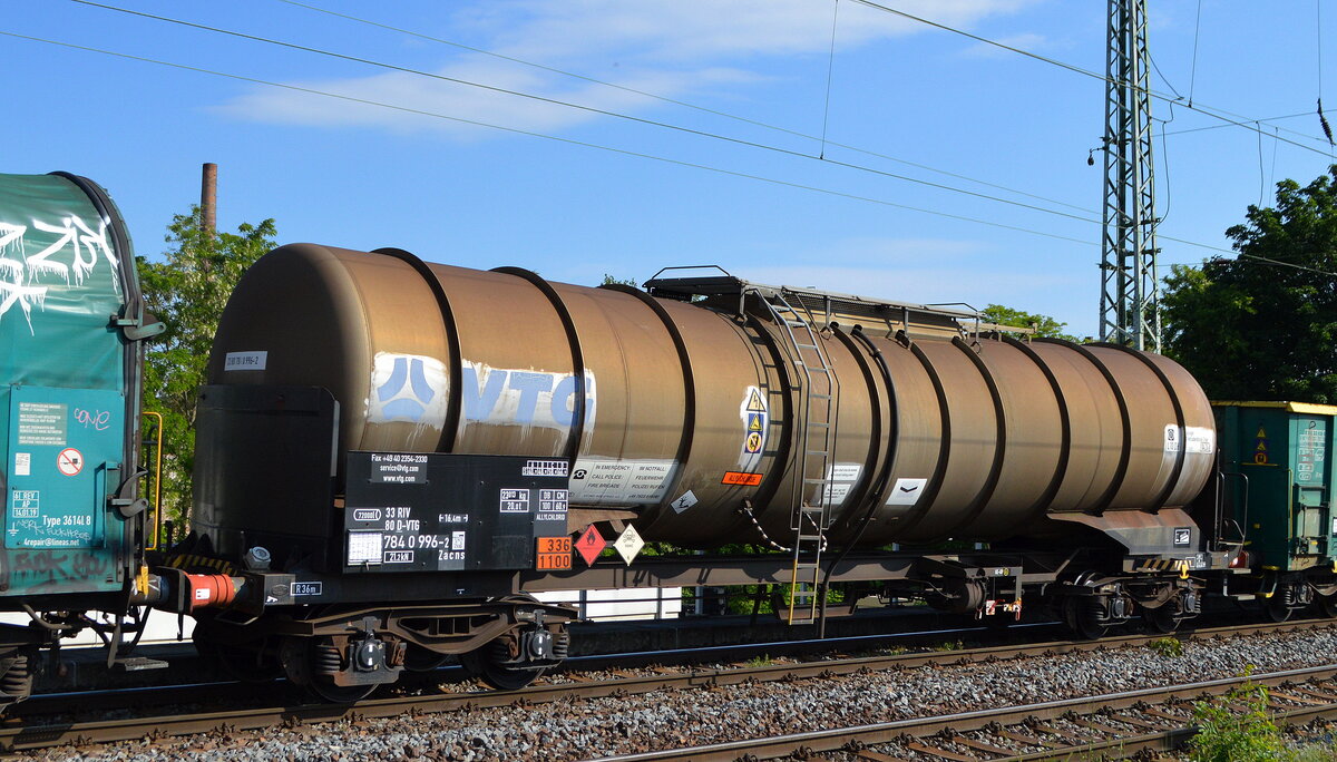 Recht neu aussehender Druckgaskesselwagen vom französischen Einsteller ERMEWA SA mit der Nr. 33 TEN 87 F-ERSA 7811 096-9 Zags (GE) für das Ladegut lt. UN-Nr.: 23/1969 = Isobutan am 01.06.22 in einem gemischten Güterzug Bf. Magdeburg-Neustadt.