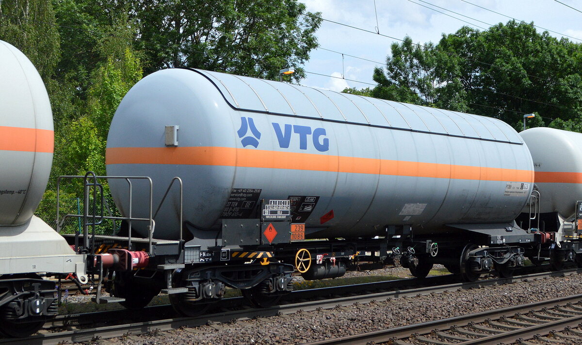 Druckgaskesselwagen mit Sonnendach vom Einsteller VTG mit der Nr. 37 TEN 80 D-VTG 7809 610-4 Zagns (GE) für das Ladegut lt. UN-Nr.: 239/1086 = Vinylchlorid, stabilisiert (Grundsubstanz zur Herstellung von PVC) in einem Ganzzug am 08.06.22 Höhe Bf. Niederndodeleben (Nähe Magdeburg).