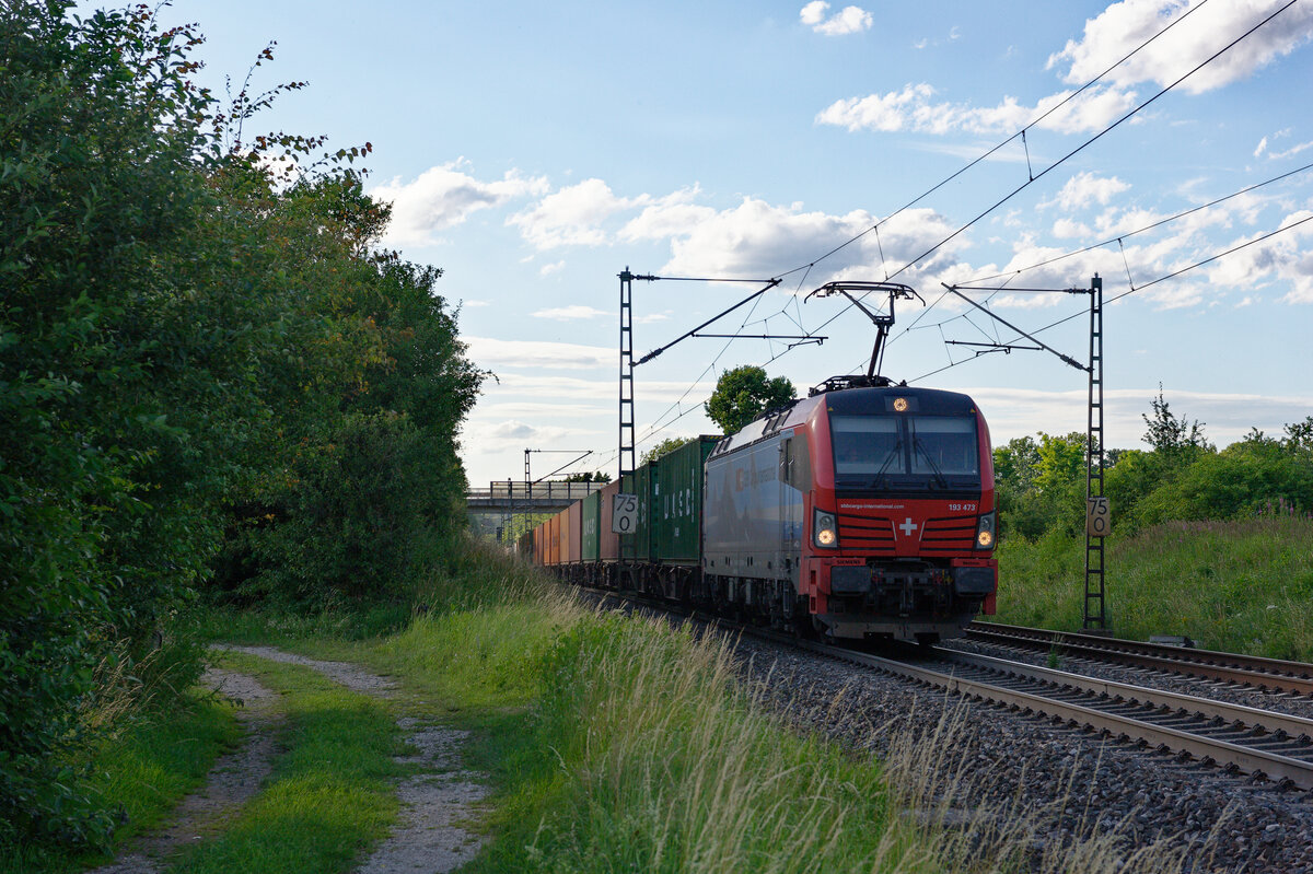 Mit einem Zug aus Containern durchfährt MRCE Vectron 193 651 den Bahnhof Plattling. Ziel des Zuges dürfte wohl einer der Nordsee-Häfen sein. 24.02.2022