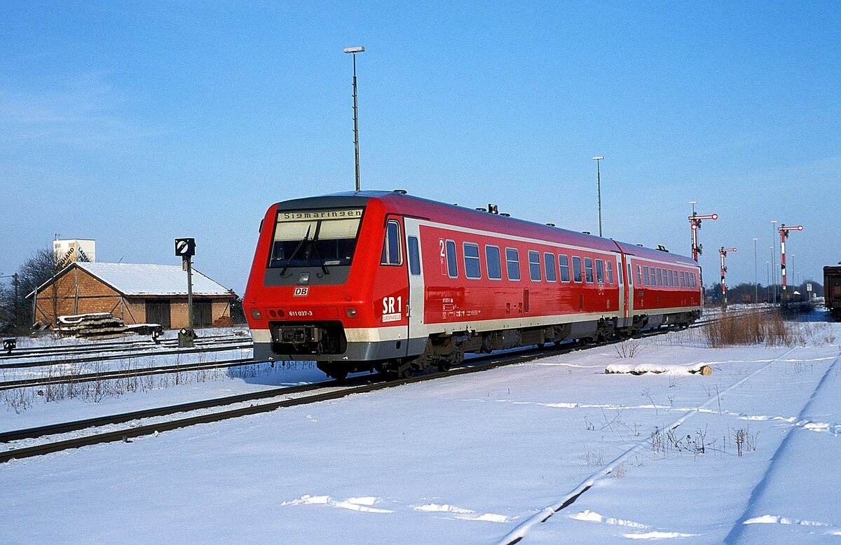 612 515 als IRE 6 / 3260, Ulm - Aulendorf - Stuttgart, bei der Einfahrt in den Bahnhof von Biberach (Riß) am 19.01.2021. Der rechts im Vordergrund hängende Kasten mit der Beschriftung "Handverschlüsse" wurde bewußt mit ins Bild genommen, weil den Fotograf interessieren würde, was "Handverschlüsse" sind und wofür diese bei der Bahn verwendet werden bzw. wurden.