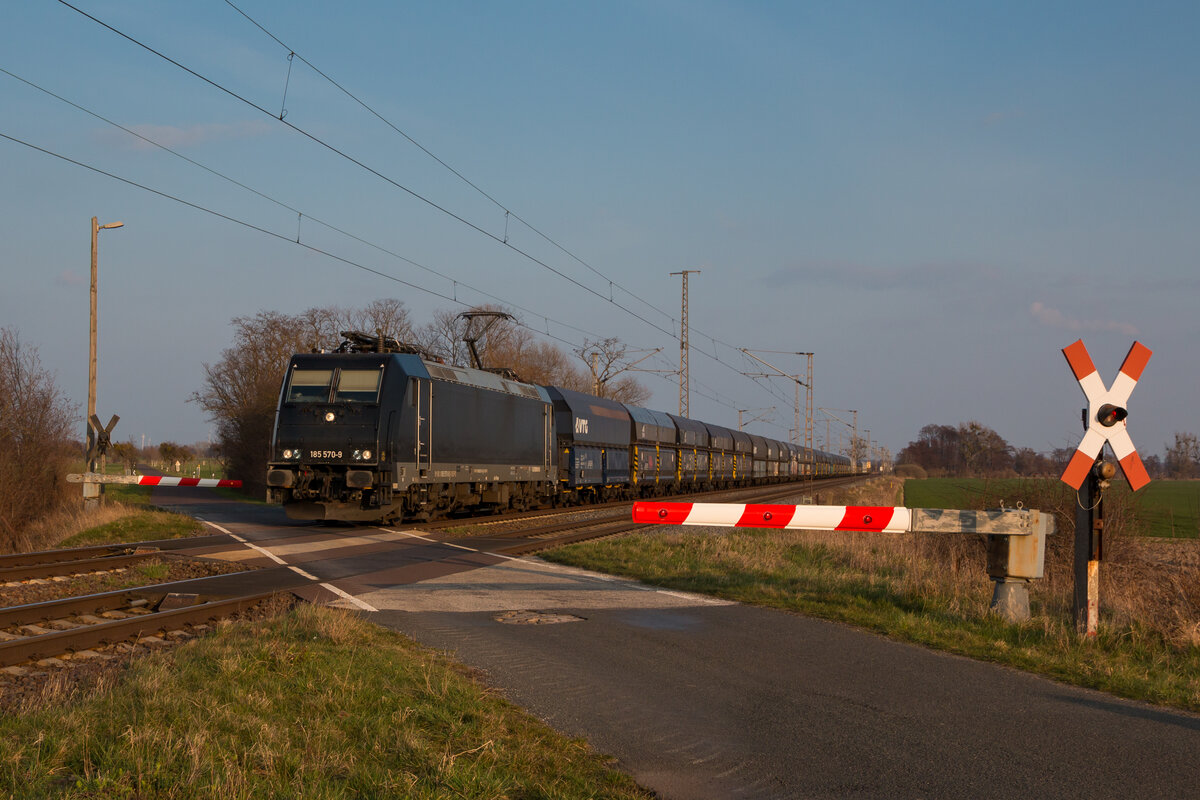 Bevor im Frühjahr 2021 die Bauarbeiten an der Elbbrücke bei Magdeburg losgingen, musste ich auch endlich mal nach Güterglück... In Magdeburg groß geworden, aber vorher noch nie dort gewesen. MRCE 185 570-9 ist hier mit einem Kohleganzzug in Richtung Magdeburg unterwegs. Fotografiert am 26.03.2021