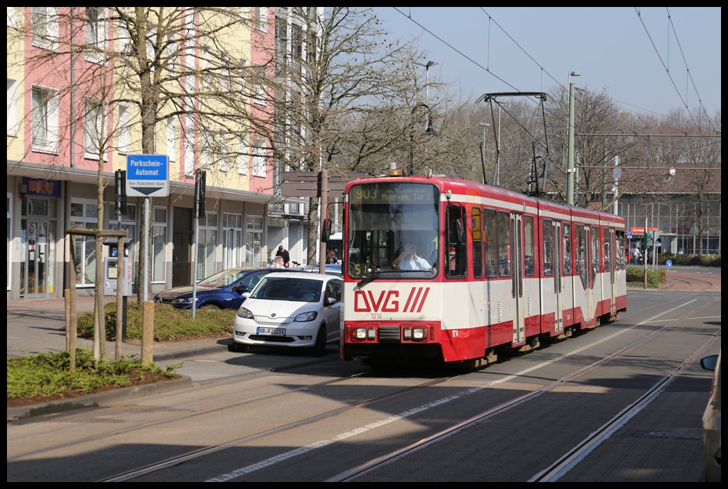 Tram 1014 der DVG ist am 23.3.2022 am Beginn der Strecke am Bahnhof Dinslaken gestartet und ist hier in Richtung Duisburg auf der Friedrich Ebert Straße in Dinslaken unterwegs.