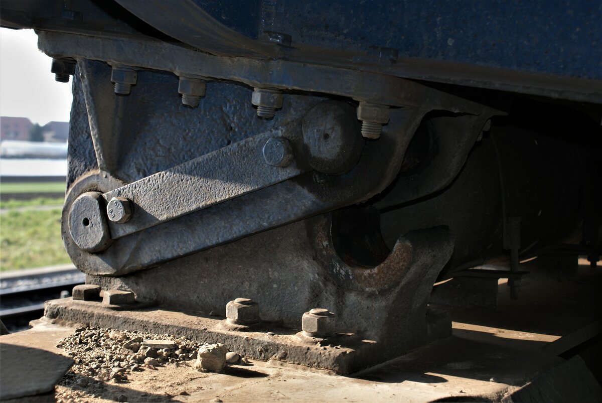 ASM BTI Aare Seeland mobil AG Biel-Täuffelen-Ins-Bahn: Fa 573, Lagerbock des Kippkastens, Kippkasten in Transportstellung, Siselen, 20. März 2022. Der Kippkasten lagert auf fünf derartigen Böcken. Der Fa 573 verfügt über eine Uebergangskupplung zur GF-Kupplung der Triebwagen.
