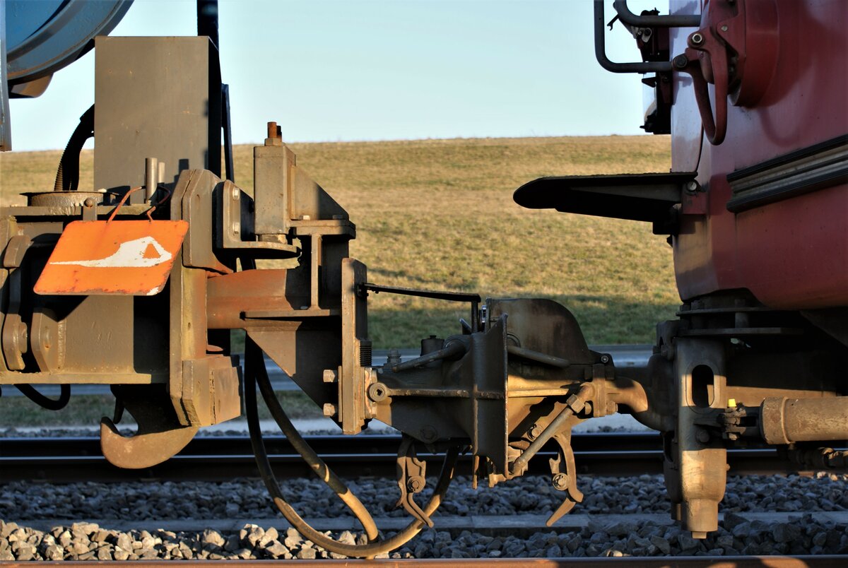 ASM BTI Aare Seeland mobil AG Biel-Täuffelen-Ins-Bahn: Fa 573 + Be 4/4 525, Siselen, 5. März 2022. Unterschiedliche Technik und Höhenlage der Kupplungen erfordern eine besondere Uebergangskupplung an den Fa zum Kuppeln mit der GF-Kupplung der Triebwagen.
