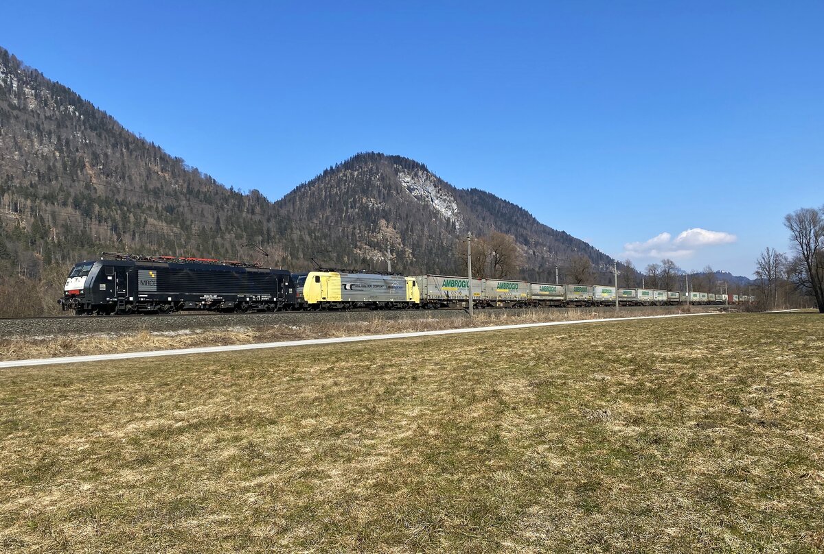 Für den Ambrogio-KLV Richtung Verona waren am 05.03.2022 die 189 937 und ihre noch gelb lackierte Schwester 189 902 zuständig. Bei Schaftenau konnte die Fuhre am späten Vormittag dokumentiert werden.
