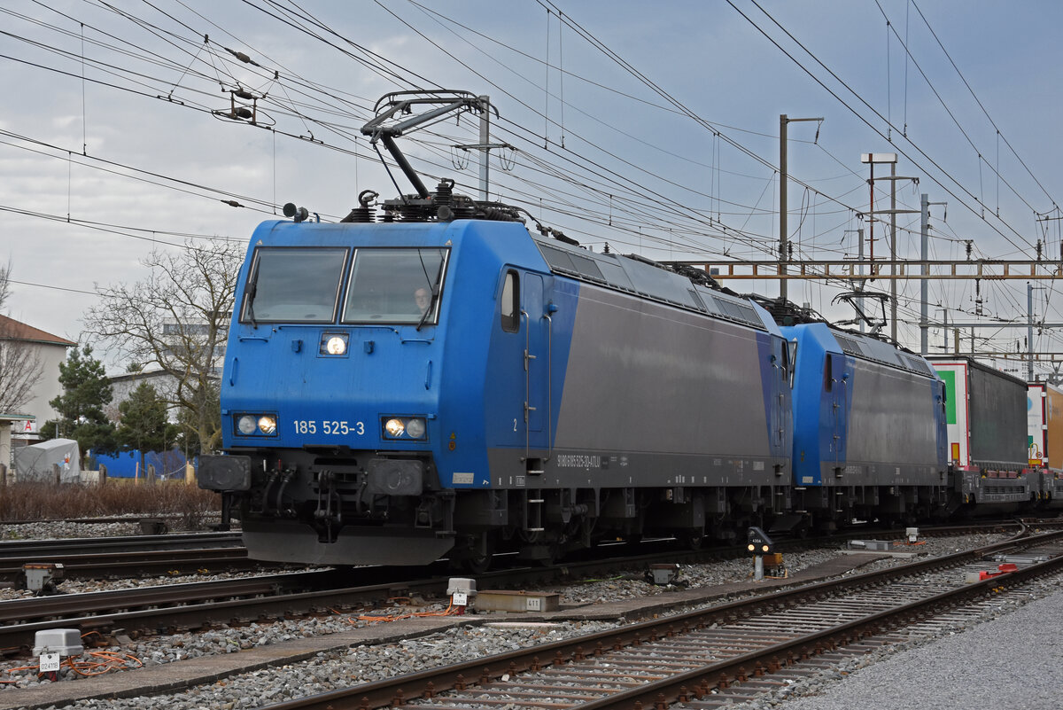 Doppeltraktion, mit den WRS Loks 185 525-3 und 185 527-9 durchfährt den Bahnhof Pratteln. Die Aufnahme stammt vom 18.02.2022.